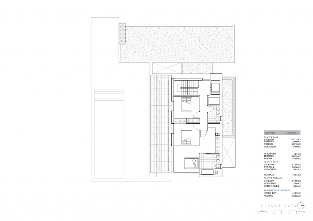 Modern two-story villa with a total built area of 395.71 m². The house is distributed over two floors. The ground floor includes a large open-plan kitchen, living-dining area, utility room, and one bedroom. The upper floor contains several spacious bedrooms with built-in wardrobes and access to a balcony with panoramic views.
